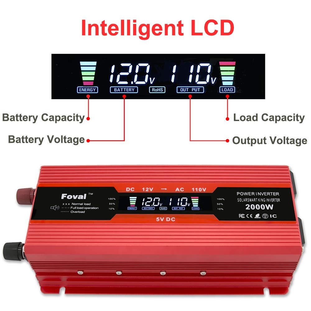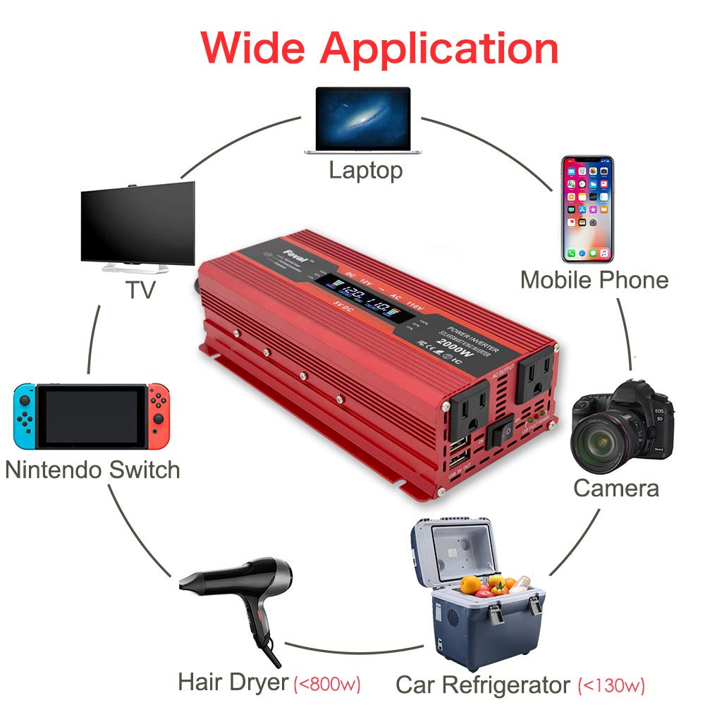 - POWERFUL OUTPUT: Convert power of DC 12V to AC 110V 60Hz. Provides 1000 Watts continuous modified sine wave power and 2000 Watts peak power. Featuring 2 AC outlets and Dual 3.1A USB ports for multi-purpose charging. Great High efficiency: conversion efficiency > 90%.