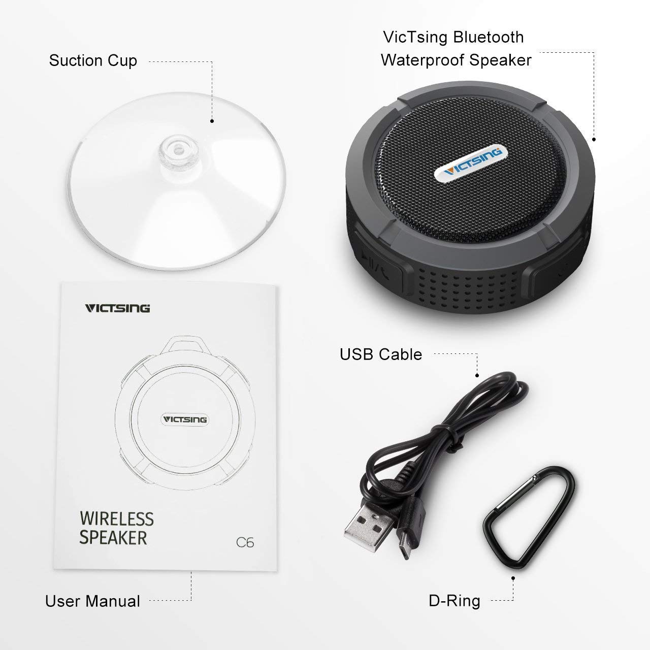 - Detachable Suction & Aluminum alloy metal hook. With firm suction cup and Aluminum alloy metal hook, feel free to hang and attach this portable bluetooth speaker anywhere you want.